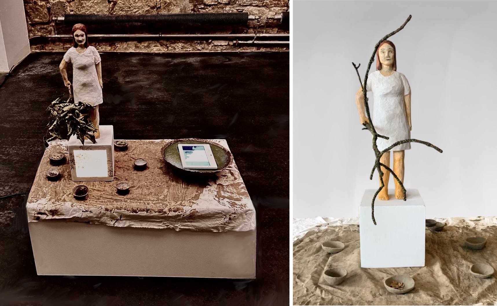 Installation aus mehreren Teilen, verschiedene Materialien und Digitalanimation in großer Schale