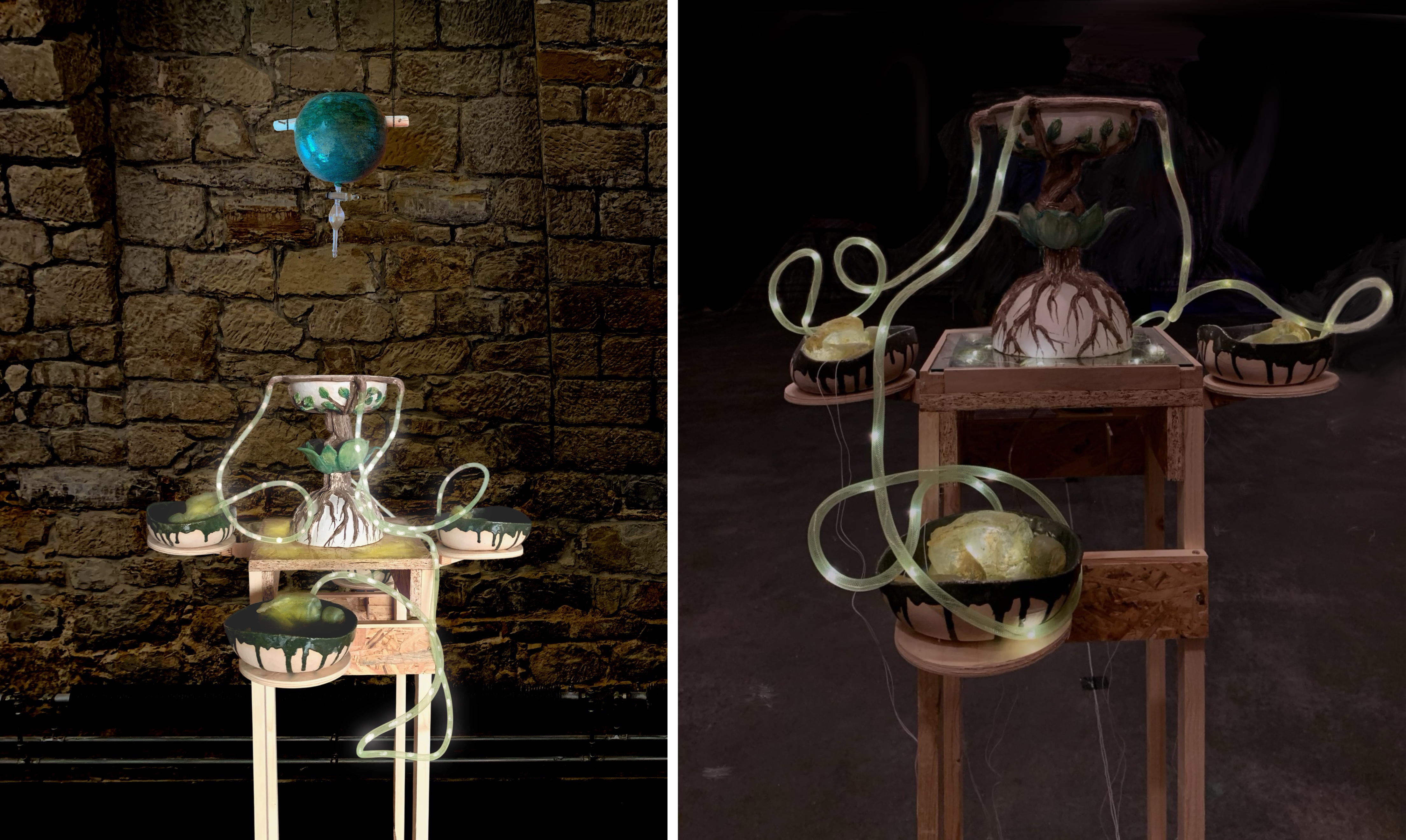 Installation aus mehreren Teilen, beleuchtet und mit tropfendem Wasser, verschiedene Materialien