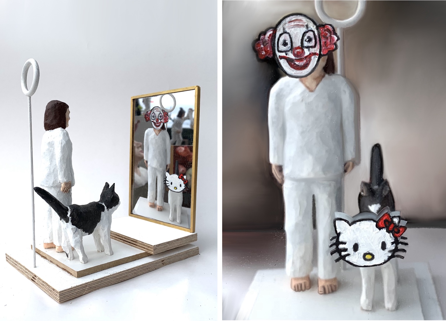 Die Künstlerin, die sich für bissig und zeitkritisch hält, und ihre Katze, die glaubt, ein wilder Löwe zu sein, stehen vor dem Spiegel. Dieser gehörte einst dem chinesischen Kaiser Zhao. Es wird erzählt, dass, wer hineinschaut, sein wahres Wesen gespiegelt sieht. Katze und Künstlerin blicken in den Spiegel. Was sehen sie? Ein lächerlicher Clown und die niedliche Sanrio-Kitty blicken ihnen entgegen.